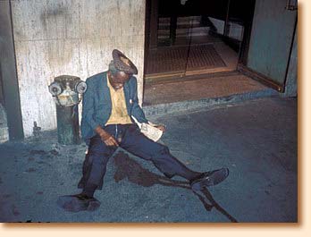 And he, too, fell asleep, around ten or eleven p.m. I wondered a bit whether I should stay and keep watch over him, since we had become good friends. I have so often seen poor black and Puerto Rican housewives with children and shopping bags walk over and trample on dead-drunk bums or kick them and afterwards quickly continue home to the pots and pans – a manifestation of their own self-hatred or lack of self-esteem. (In the same way I have often seen rich blacks of the "nouveau-riche" type – that frightening phenomenon we see everywhere in the Third World trample spiritually on the poor blacks left behind in the' ghetto.) But since the streets were rather empty that night I decided to leave him after having put a good load of scrap wood on the fire. I wandered down to my favorite area around Avenue B (the "free-fire zone"), where there are always fights between the Puerto Ricans and the blacks, but which I like a lot because there is an almost even racial balance among whites, browns, and blacks. Here I saw Larry standing in a doorway. We started talking and he told me that he had just been thrown out by his white wife. When we realized we were in the same boat, we decided to go together to find a place to stay. First we bought a bottle of wine. Then we promised each other that if one of us found a place, he wouldn't take it without taking the other one with him. Larry was more extroverted and eloquent, but I was white, so we figured that what one of us didn't have, the other could make up for. But Larry was the type who had to rap with everybody