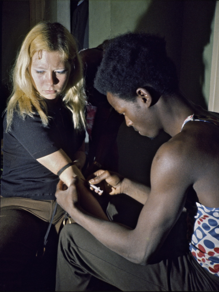 This photo was taken the day after Aline, into whom Don injects heroin, killed a taxi driver. I had come hitchhiking to Jacksonville, FL the night before where I met the black girl Diane who promised to find me a place to stay. She and her friend Aline kept me waiting in a nightclub while they explored their options. Sometime later they came back all upset and said we were going to a motel. While we shared the bed there, I watched them pray all night long in between attempts to inject heroin: "Oh, please, God, let him not die." To get money for the motel, they had given a blow job to a white cab driver in a dark alley, but - it slowly dawned on me - had then hit the cab driver with a cobblestone to steal money also for a shot of heroin, too. The next morning, they slept it off and were mostly annoyed at being late for church, where they should have been singing in the church choir. The next evening, they again tried to find a place for me to stay and after much wandering around we ended up at their drug friend, Don. Shortly after I took this picture, we were all sleeping on his mattress where in the dark I could hear them having wild sex. I took some flash photos of their interracial sex, which the American photo developers refused to make prints of at the time. Hence this slightly nicer version of the whole prelude.