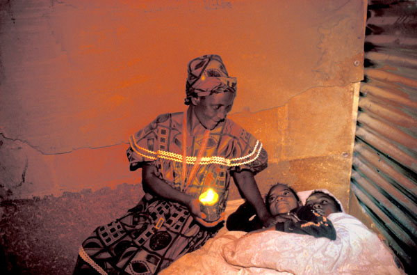 Mother telling nursery rhymes for her children at bedtime in Katutura - a slum in Windhoek.