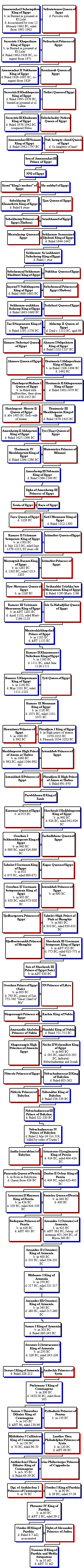 Note that the line below is a simplified line since many of the pharaohs are actually married to their sisters or daughters which is difficult to show genealogically. To see the actual family relationship of Amenemhat I, click here. To go back to line of descend, click here. |